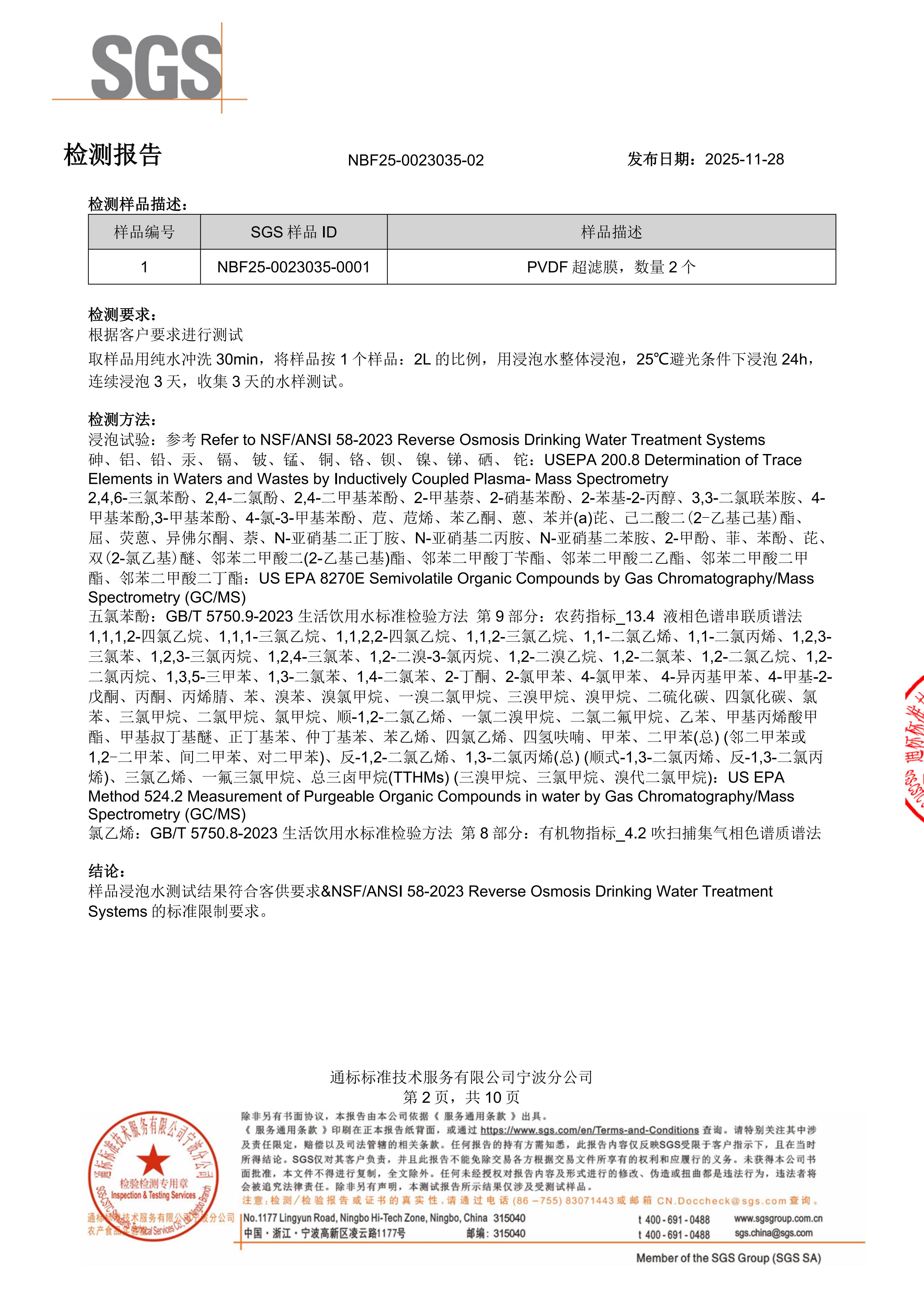 2)2025年9月26日,经SGS检测,诚荣PVC超滤膜符合NSF/ANSI 58-2023标准