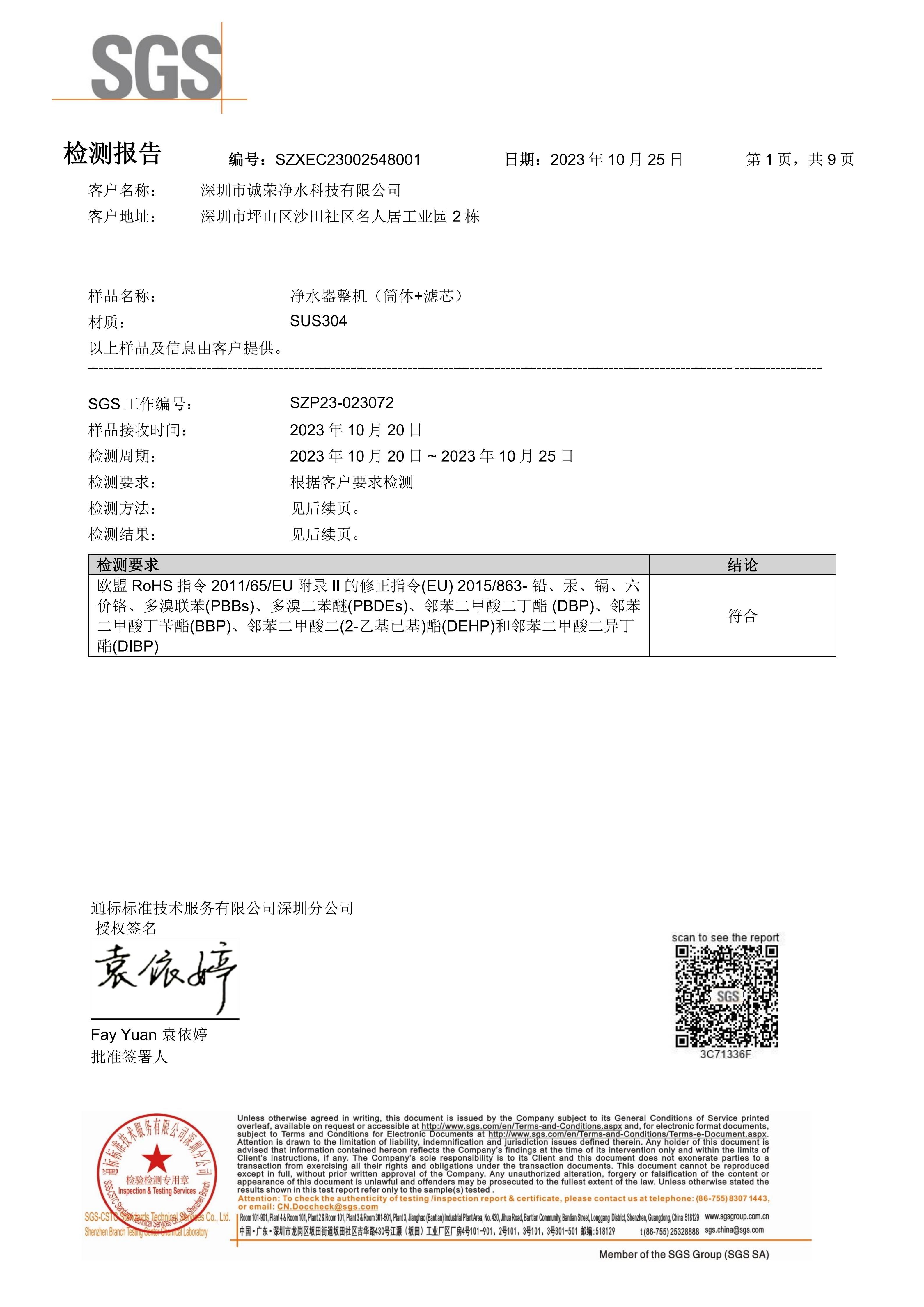 1)2023年10月25日,诚荣超滤净水器整机(筒体+滤芯),经SGS检测,符合欧盟RoHS环保要求