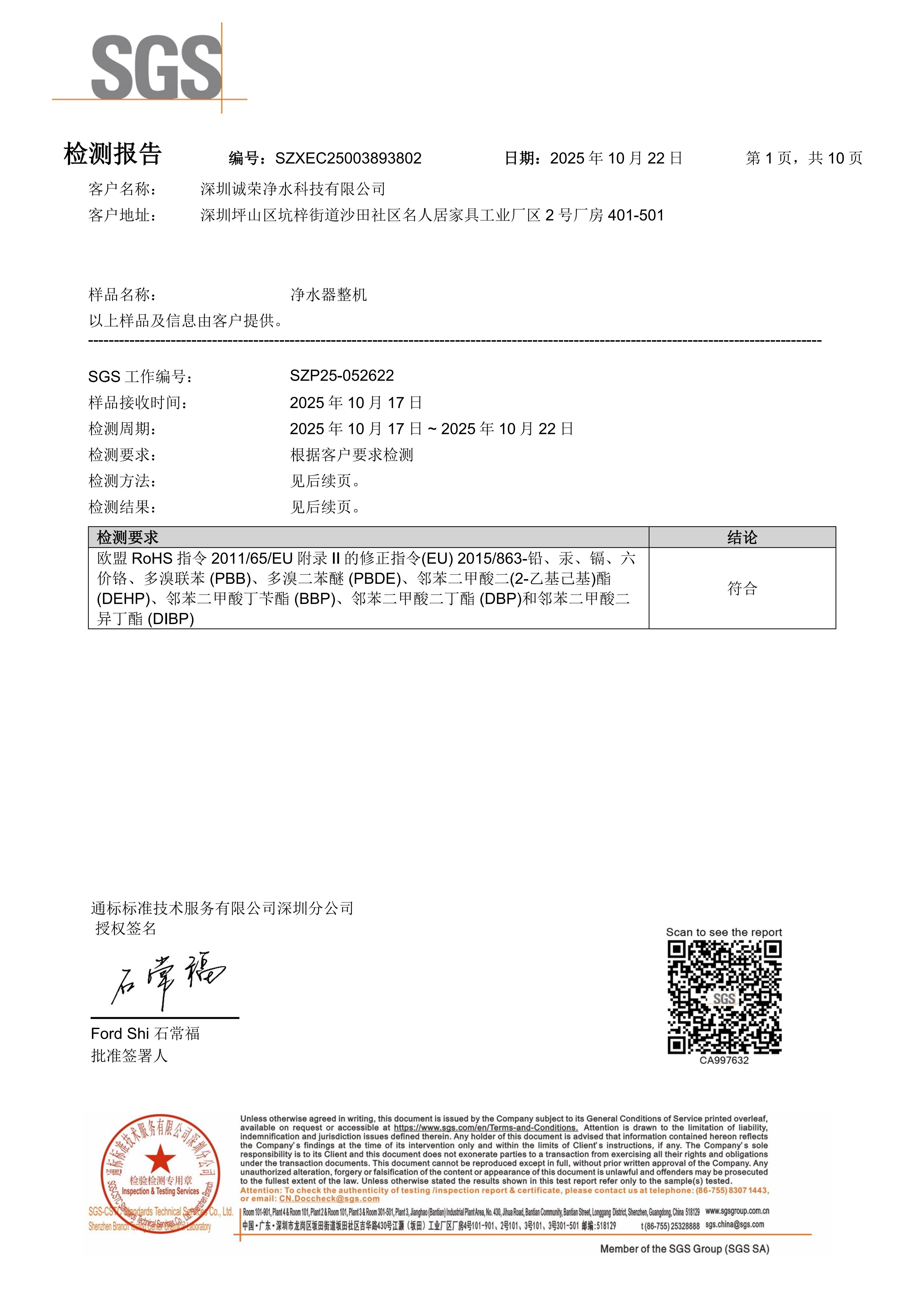 3)2025年10月22日,诚荣超滤净水器整机(筒体+滤芯),经SGS检测,符合欧盟RoHS环保要求