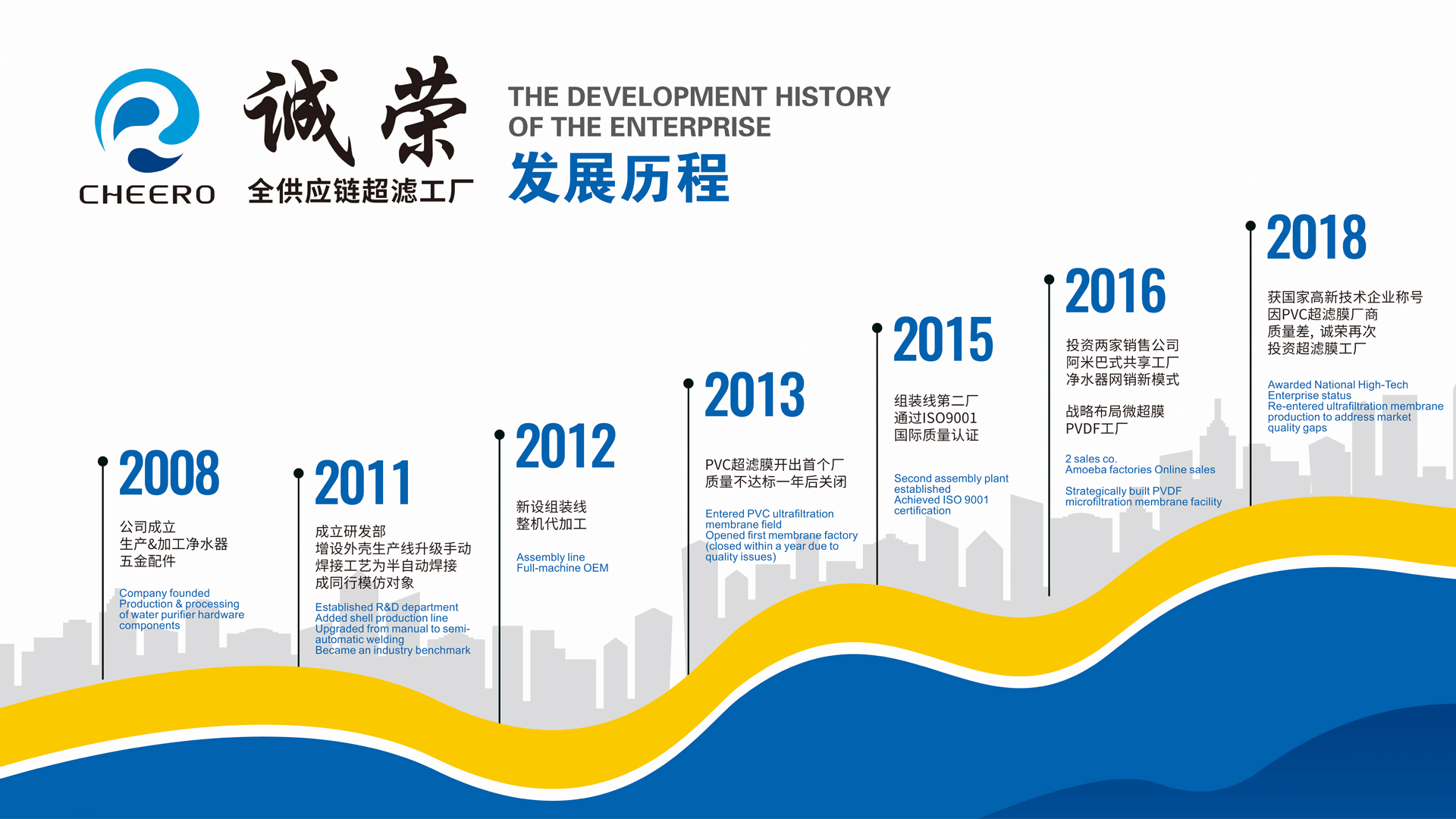 1 )诚荣工厂创立于2008年5月6日,是硕果仅存的超滤膜及超滤净水设备全供应链工厂,是全球同行对标的超滤行业标杆。