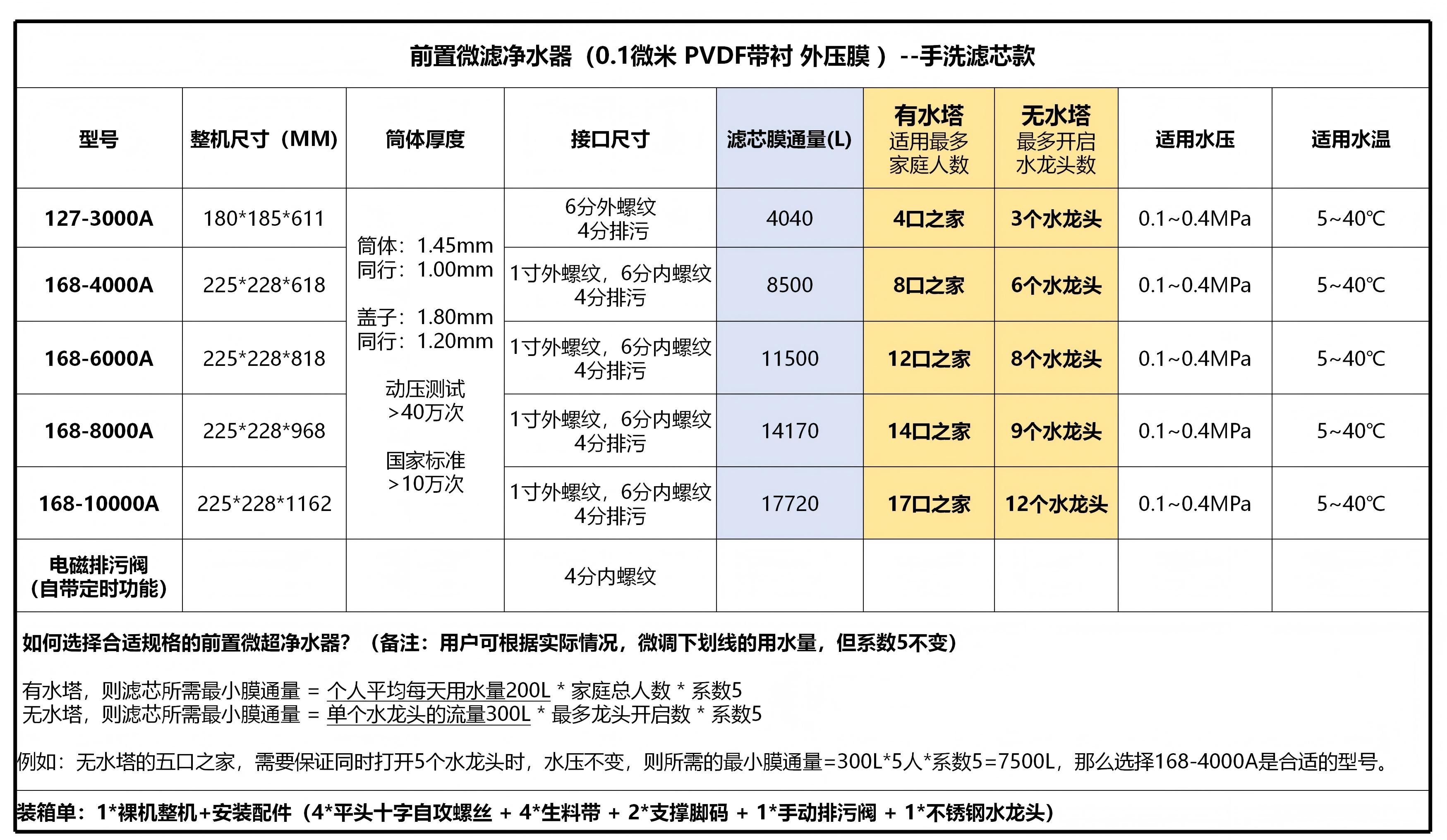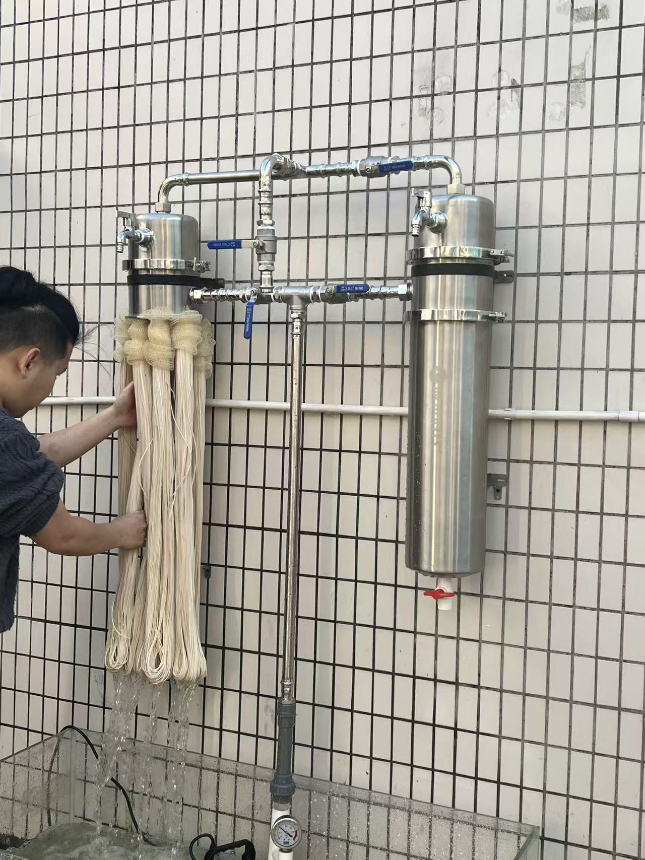 跟他聊了一下,我就找到原因了,他买的滤芯规格太小了,而且它把超滤净水器安装在水箱后面,导致超滤净水器的制水速度跟不上家里的用水速度。所以我根据他家里的用水量计算了适合他的滤芯规格,推荐了合适的型号给他,顺便,让他把之前买的那台超滤净水器作为一个反冲洗装置使用,专门用来反冲洗诚荣时代的前置净水器,这样可以彻底把滤芯洗透,滤芯用5年完全没问题。