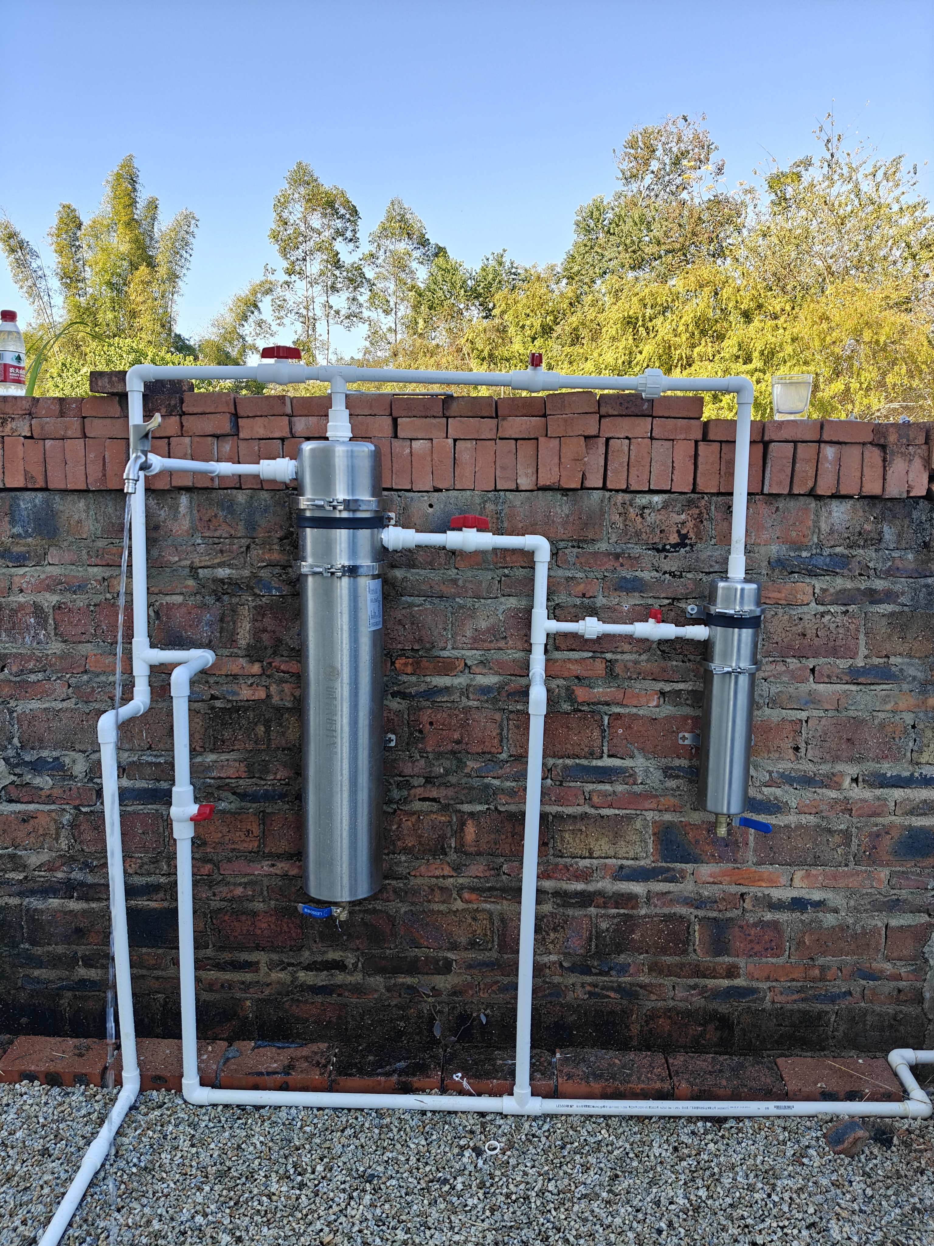 他家是农村自建的两层小别墅,平时用的是井水,但是井水有个问题,一到下雨天,就会变得很浑浊,里面很多悬浮的黄泥浆,不仅影响正常生活用水,而且衣服洗了马上被染成了黄色,为此他想了很多办法,甚至还自制了一个净水设备,但发现没有过滤效果。但是,跟他沟通之后,发现井水的流向是”井--深井泵--二楼楼顶水箱--一楼自制净水系统--水箱--加压泵--家庭总进水管管道--家庭终端用水“,刘先生的这套水路网路设计的非常科学,我看过之后都非常欣赏他的动手能力。