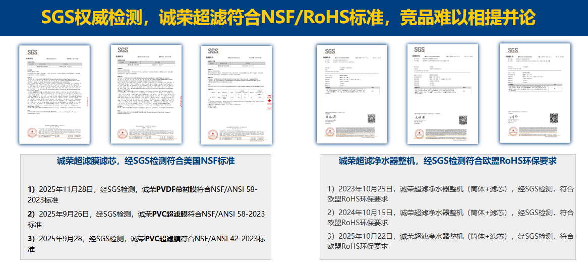 在诚荣时代成立之前,诚荣超滤工厂主要做B端。在不锈钢管道超滤界,我们真的算是行业内的代工王了,另外,有好几个全球一线大品牌的ODM/OEM,也是在我们工作做的,所以早在几年前,我们的滤芯就会送检SGS做检测,看是否符合美国NSF标准。我们的超滤膜滤芯都是从产线上随机抽取的,所以是能反映出我们工厂超滤膜滤芯的整体制造质量的。SGS的检测成本是很高的,但是它的检测流程规范、检测结果权威,我也想知道我的滤芯,在第三方机构看来,到底处于什么样的质量水平。我觉得做品牌,就不能怕做无用功。如果我做检测,只是为了制造一个营销卖点,那我就不选SGS机构做检测了,价格还能便宜一点,但是我觉得没意义,因为我需要的并不是一份检测报告,而是权威的机构,针对诚荣超滤膜出具的一份权威检测数据。我觉得,如果我们做什么事情都是不见兔子不撒鹰,是很难逮到猎物的,我们应该在有限的能力范围内,多撒鹰,即便没抓到兔子也无妨,就当锻炼身体了。回顾诚荣的发展历程,我们的制造水平与研发能力,往往都是在亏钱也要帮客户把产品的质量做好中提升的,恰恰是因为我们先亏钱了,后面反而赚钱了,因为我们从不过度承诺,一旦承诺了,哪怕亏钱我也尽全力帮客户把产品做好。有网友说,诚荣时代的滤芯只是符合NSF标准,并不是NSF认证,所以我们的所谓检测只是噱头。我觉得,做NSF认证才不可理喻,你知道做NSF认证多贵吗?花大几十万,只是为了跟客户说,诚荣时代的滤芯符合NSF标准,大家可以放心购买,而做认证的钱呢?还是终端消费者买单,我觉得不值!因为送检SGS也可以按照NSF标准做检测,它们对于消费者产生的效益之差,相比于它们的成本而言,微乎其微。所以,诚荣时代的超滤膜滤芯,没有做NSF认证,但是我们会随机抽样,送检SGS,按照美国NSF标准,做检测。我觉得,不管是对工厂而言,还是对客户而言,我们这种做法才是理性的,负责任的做法。因为送检SGS,谁也无法操控检测结果,该是什么样子就是什么样子。不管是诚荣PVDF带衬膜,还是PVC合金膜,经SGS权威检测,符合NSF/ANSI 58-2023标准。我们的超滤净水器整机,连续三年送检SGS,符合欧盟RoHS环保标准,我相信,这样的检测结果,在行业内也是难找第二家的。诚荣超滤,客户从没顾虑。十年不生锈十年不漏水十年也售后诚荣时代®净水器,从不在质量上原谅自己深圳诚荣,管道超滤界前三甲,行业内没有第二家的全供应链超滤工厂,多个全球一线品牌背后的ODM/OEM工厂。默默蛰伏管道超滤19年,于2025年中旬迎来诚荣时代®,品质比保险公司还保险,服务比客户还客户。