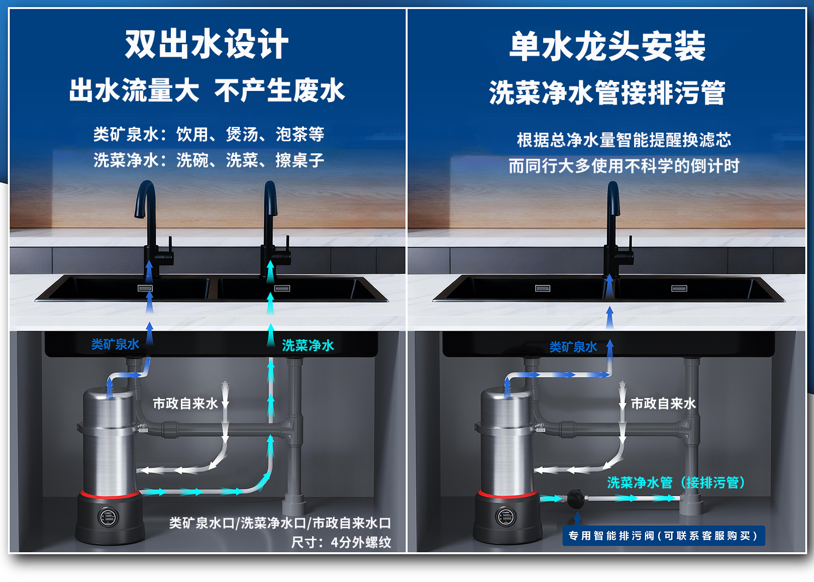 厨房厨下净水器,功能是过滤用于饮用、煮饭和煲汤的净水。除了干净,还要兼顾口感与健康。