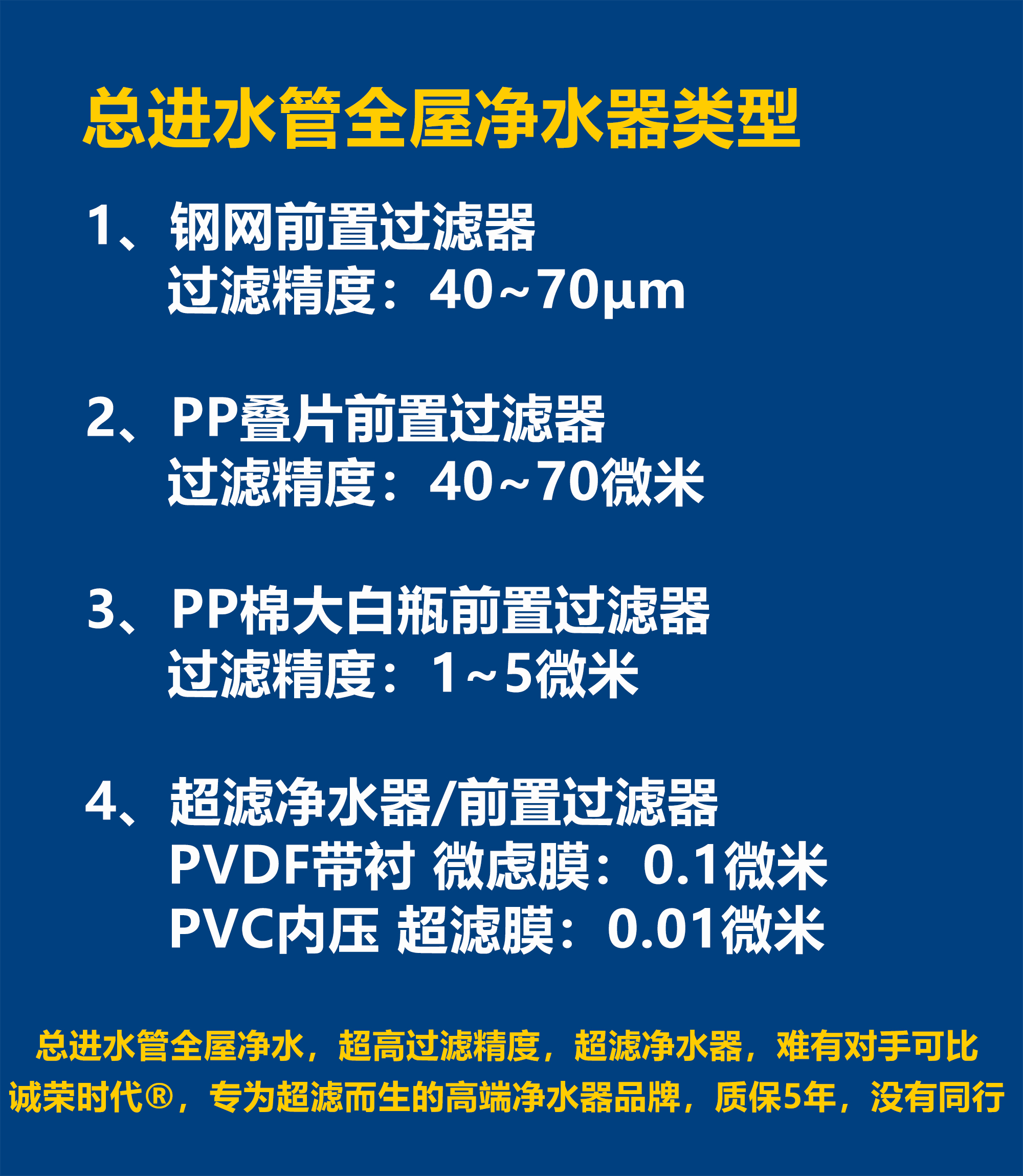 钢圈前置过滤器/PP叠片过滤器,过滤精度为40~70μm。超滤净水器,分0.1μm微滤净水器和0.01μm超滤净水器两种。
