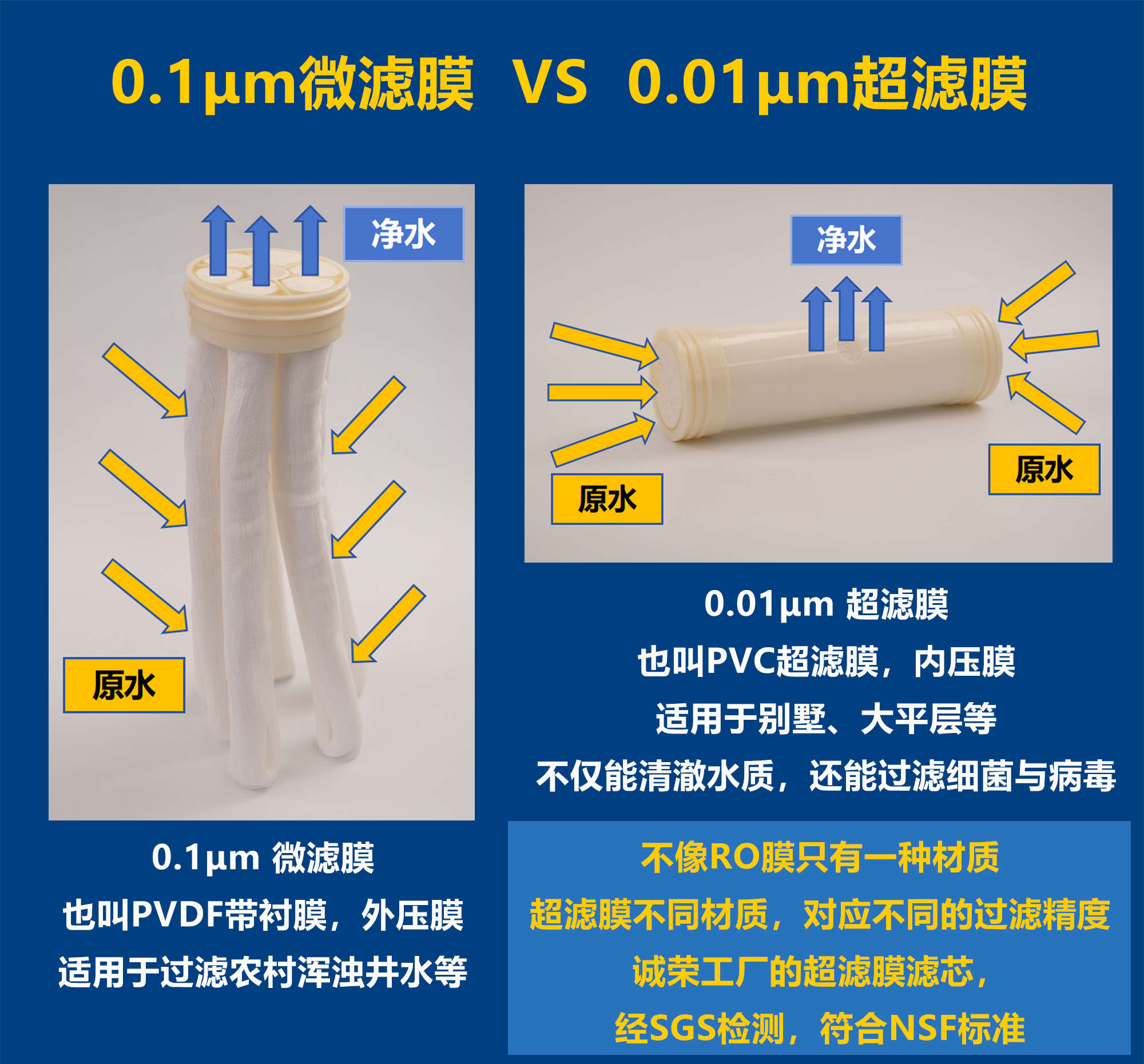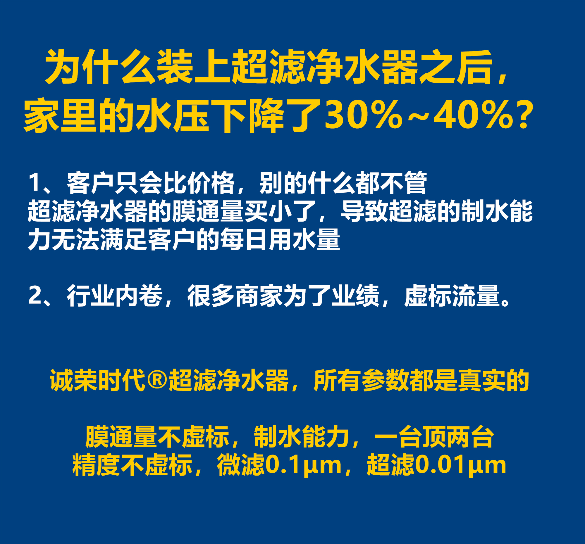 到了这个时候,你自己也能得出一个结论,要想达到真正的全屋净水器效果,超滤净水器是难有竞品可比的选择。诚荣时代超滤净水器,在制造质量、产品功能与结构设计上做到了行业TOP1%,如果你对价格不那么敏感,且对全屋净水系统的品质有要求,那么我相信诚荣时代超滤净水器的品质,市场上难找第二家。很多客户有个疑问,为什么我装了超滤净水器之后,家里的水压下降得厉害,至少下降30%~40%?第一,很多客户买超滤净水器只会比价格,其他的什么都不管,选择的超滤净水器,膜通量太小了,导致超滤的制水能力没有办法满足客户的每日用水量。第二,超滤净水器行业内卷严重,很多商家为了业绩,流量虚标。但是诚荣时代的总进水管全屋超滤净水器,至今却没有客户反馈,家里的水压或流量下滑了。这是因为诚荣时代都是根据客户家里的用水量去推荐的滤芯规格。我们宁愿不成交,也要保证客户的用水体验。另外,诚荣时代超滤净水器的所有参数都是真实的,与同行不一样,我们膜通量不虚标,过滤精度不虚标,这就是为什么在同等膜通量情况下,诚荣时代超滤净水器的制水能力,是一台顶两台。市面上只要是超滤范畴内的滤芯都是标注的0.01微米,但是作为行业内没有第二家的全供应链超滤工厂,我们一定要区分微滤膜与超滤膜,因为诚荣时代是一个专业的高端净水器品牌。