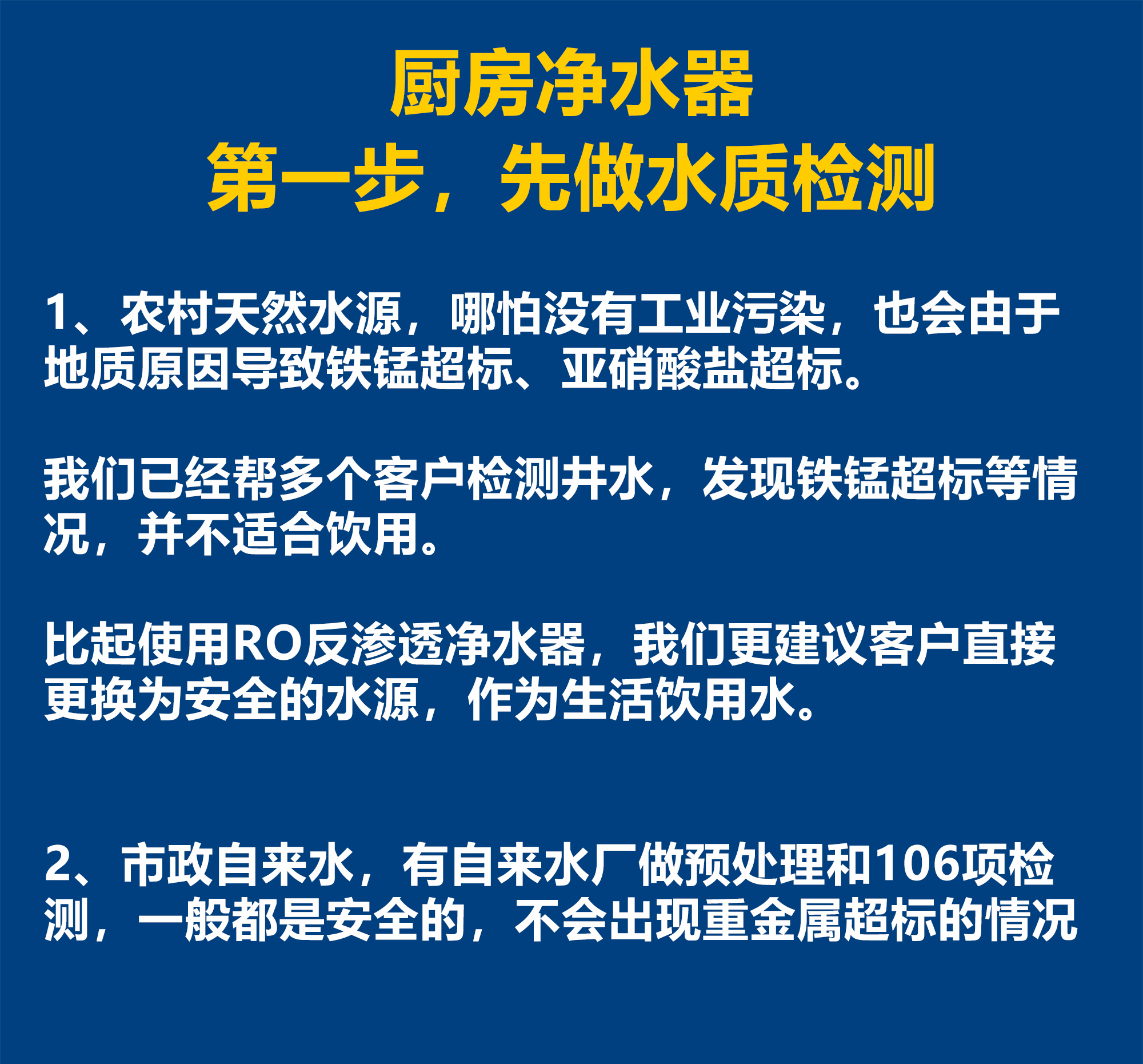 现在大家的经济条件都是可以的,所以我特别建议在农村使用天然水源的客户,在用作饮用水之前,先去做个水质检测。因为不少农村地区的天然水源,即便没有受到工业污染,由于地质原因,也会发生铁锰超标或者亚硝酸盐超标的情况,这种情况下,就属于不安全的水源。比起使用RO反渗透过滤,我们更推荐客户直接更换安全的水源。市政自来水,有自来水厂做预处理,且在出厂之前会做106项水质检测,大家熟知的TDS值只是这106项中的一项,所以一般情况下都是安全。