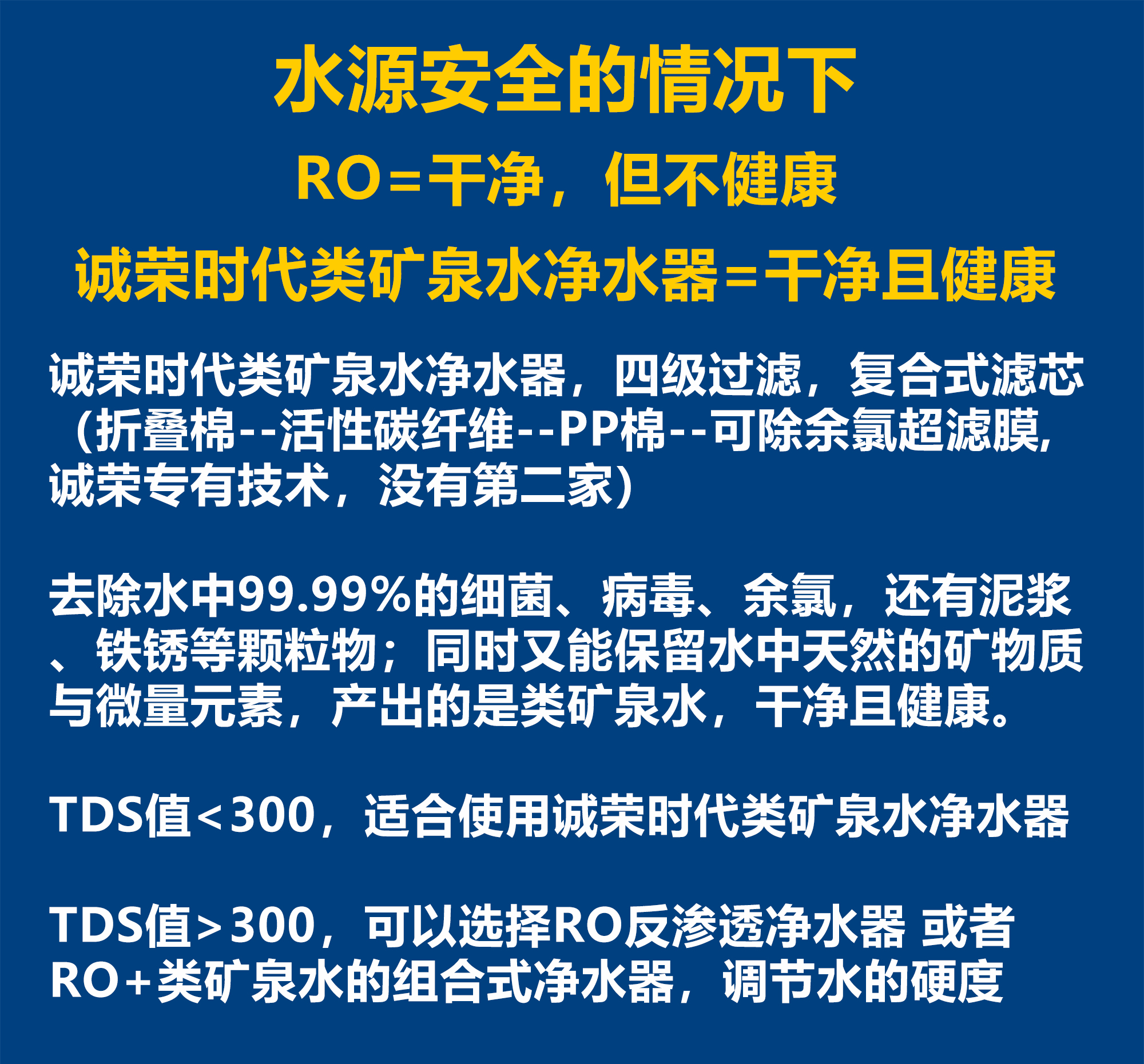 在水源安全的前提下,再根据水的TDS值和硬度来选择适合自己的厨房净水器。一种是RO反渗透净水器,产出的是干净但不健康的纯水。一种是诚荣时代类矿泉水净水器,产出的是干净且健康的类矿泉水。之所以拿诚荣时代类矿泉水净水器与RO相比,是因为可除余氯超滤膜是诚荣超滤工厂的专有技术,诚荣时代的类矿泉水净水器能去除水中99.99%的泥沙等颗粒杂质、细菌、病毒和余氯,保留水中的矿物质与微量元素,达到类矿泉水的效果,不仅干净且健康。TDS值小于300,都推荐使用诚荣时代类矿泉水净水器,因为此时水中的矿物质与微量元素,不仅有益于健康,而且会使得水的口感比较好。若TDS值大于300,水中的钙镁离子就容易形成水垢,有些客户可能会对水垢比较在意,那么可以使用RO反渗透净水器,以为RO反渗透净水器产出的是纯水。不过,现在越来越多的消费者也意识到RO反渗透出来的纯水,虽然干净但是不健康,除非水源受到严重的污染,否则没必要使用RO反渗透净水器。这也是越来越多的RO反渗透净水器,会配备再矿化滤芯的原因。但是再矿化滤芯的效果肯定不如水中的天然矿物质,因为天然矿物质中含有的多种微量元素之间的协同作用更利于人体吸收。