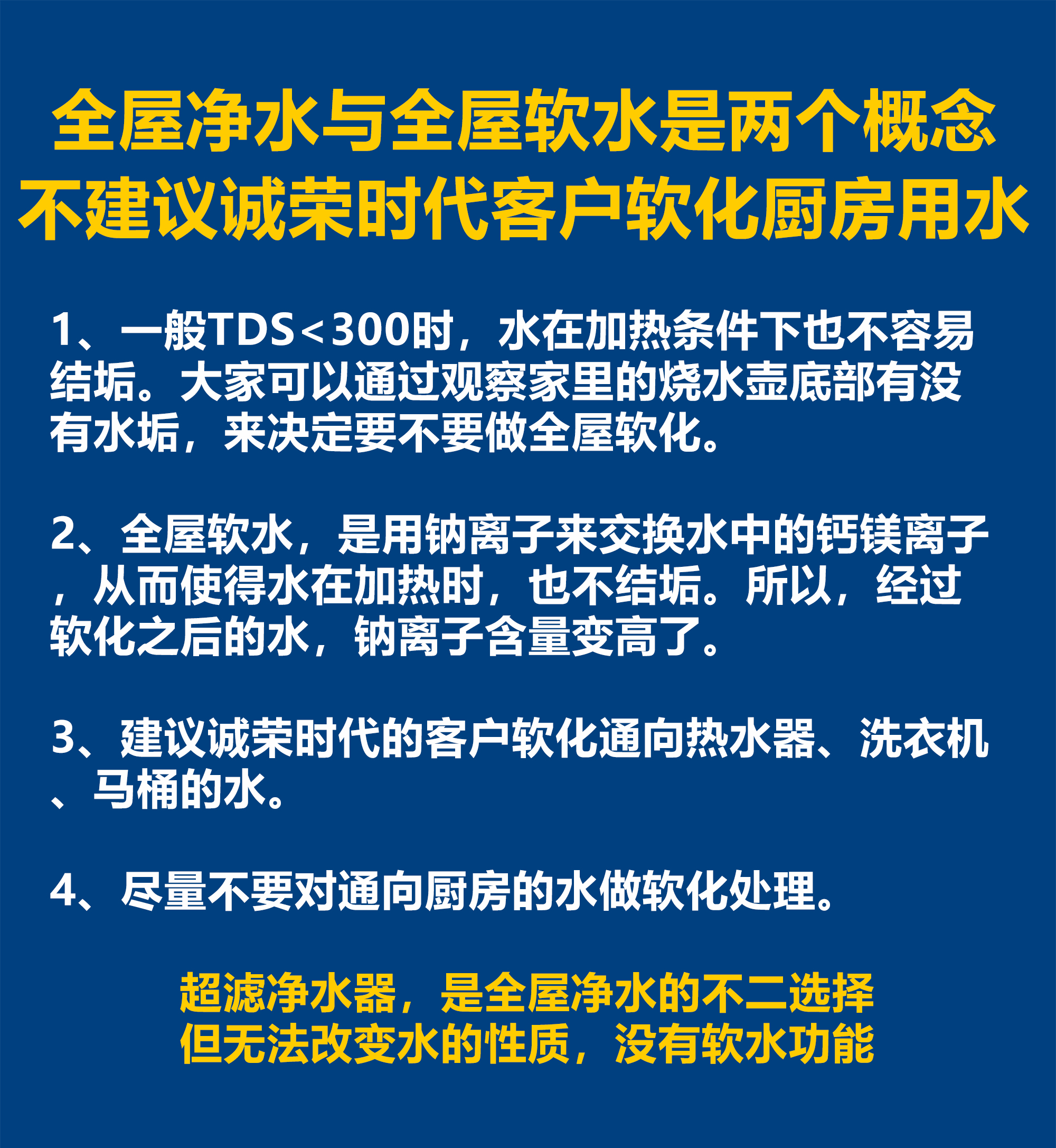 这个问题说明,很多用户都搞混了全屋净水与全屋软水的概念。水垢是水中的钙镁离子在加热条件下析出的物质。一般来说,TDS小于300时,水中的钙镁离子是不太容易结垢,大家也可以观察一下家里的烧水壶,假如家里的烧水壶在使用一段时间后,壶底的水垢特别严重,那么可以考虑做全屋软水。全屋软水是通过离子交换树脂用钠离子将水中的钙离子和镁离子置换出来,降低水的硬度,从而使得水在加热的条件下,也不结垢。经过离子交换树脂软化后的水,钠离子的含量会变高。从经验的角度来讲,我建议诚荣时代的客户只对经过热水器、洗衣机、马桶的水做软化,而不要对流向厨房的水做软化。
