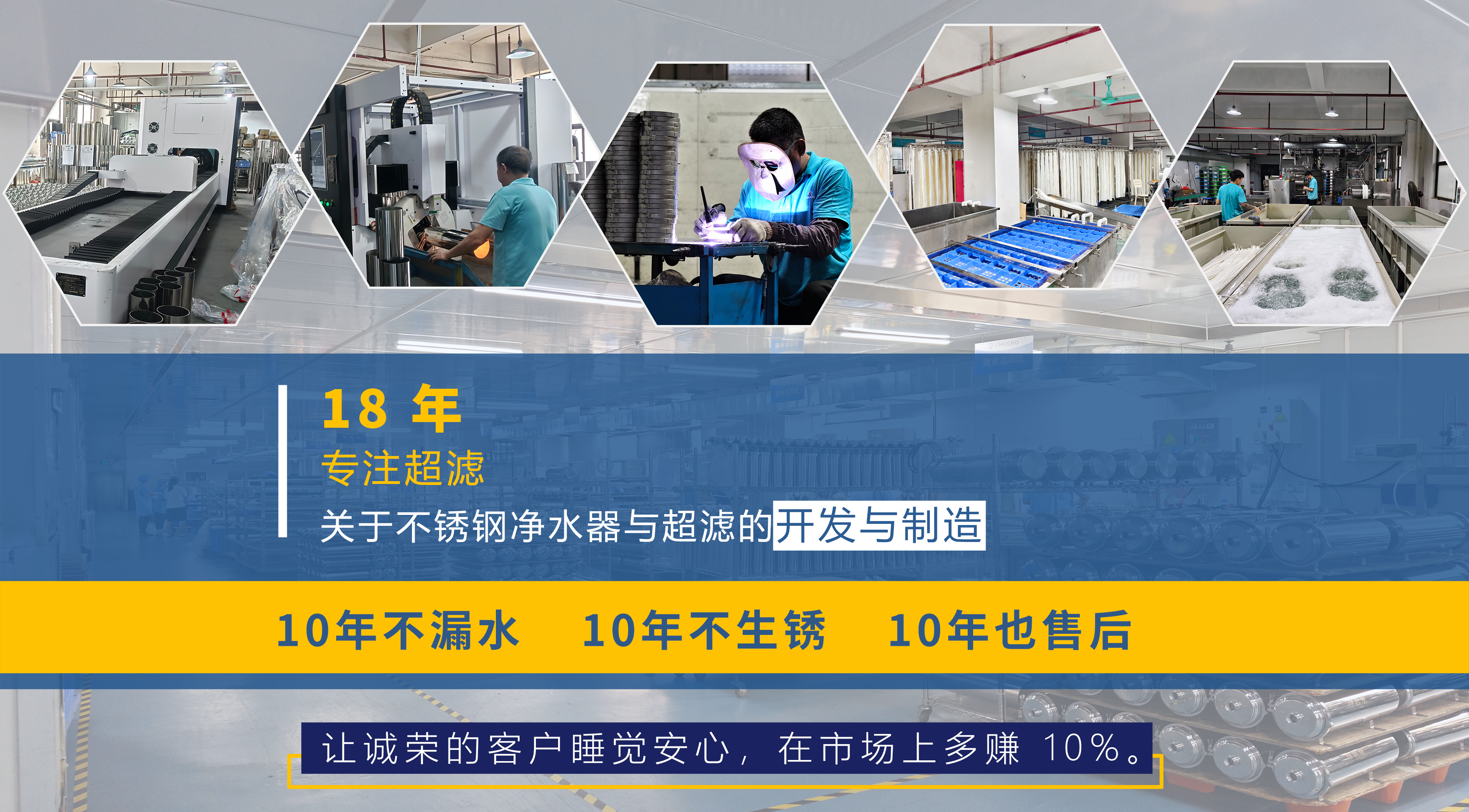 诚荣公司创立于 2008 年 5 月 6 日,是集研发、生产、销售、服务于一体的国家高新技术企业,专业专注水质净化设备领域,公司拥有产品检测中心、水质检测中心、完整的核心自主产业链,产品盖:家庭终端净水机、自来水厂净化设备、商务集中供水设备、工业中水回用等系列产品。 十五年来,公司本着以诚为荣、以客为尊、质量为本、创新为魂的理念,始终以净化水质,造福社会为使命,努力奋斗,勇往直前,从成立初期在简陋厂房生产加工净水器五金配件,到通过 ISO9001 国际质量认证,成立三家超滤膜厂,再到进军工业污水处理、中水回用、商务集中供水设备、城镇自来水工程, 一步一个脚印,逐渐发展壮大。如今,诚荣人正以新的机制、新的模式、新的工艺、新的产品和新的服务,朝着强化企业竞争力,铸就行业品牌的方向昂首阔步前进!