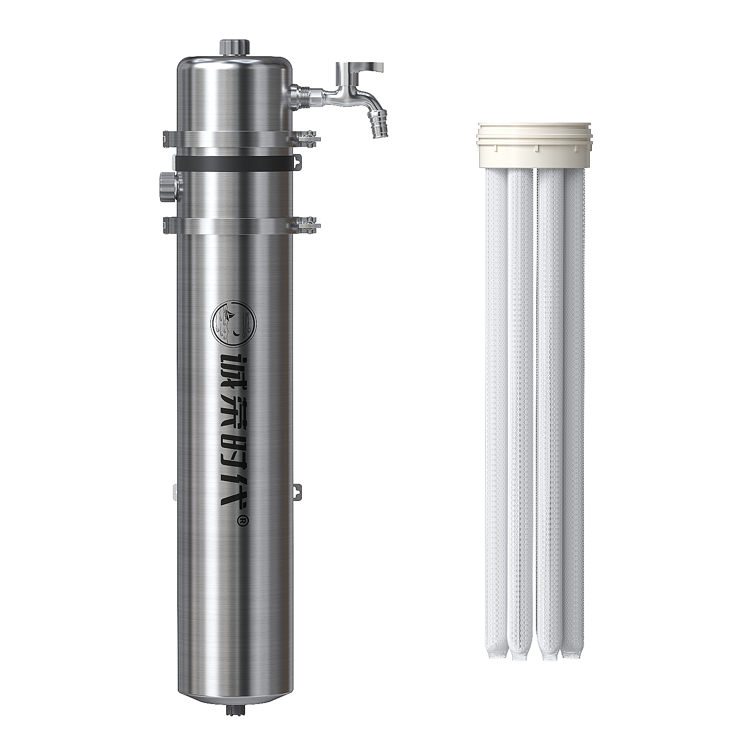 因为我们这款微滤净水器是需要定期手洗滤芯的,为了方便客户清洁滤芯,同时保证使用安全,我们讲产品设计成了双卡箍的设计,这样客户只需拆下下卡箍,卸下下半部筒体,就可对滤芯进行手洗,竞品做不到。哪怕是家庭妇女,或者身体比较硬朗的老人也能操作,行业难找第二家。
